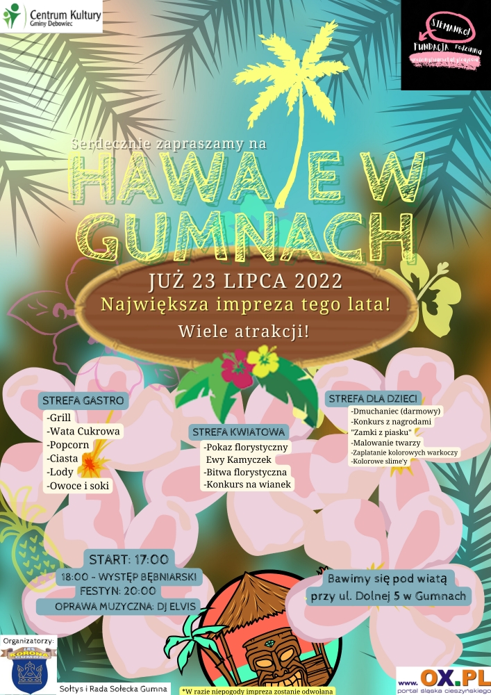 Serdecznie zapraszamy na "Hawaje w Gumnach" które odbędą się 23 lipca 2022r. pod wiatą przy ul. Dolnej 5 w Gumnach!