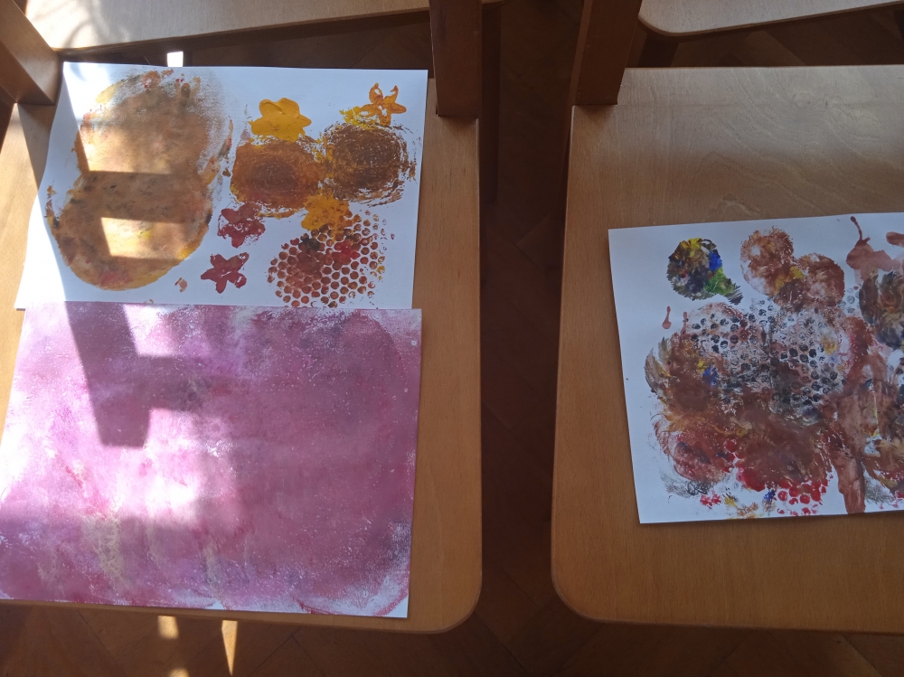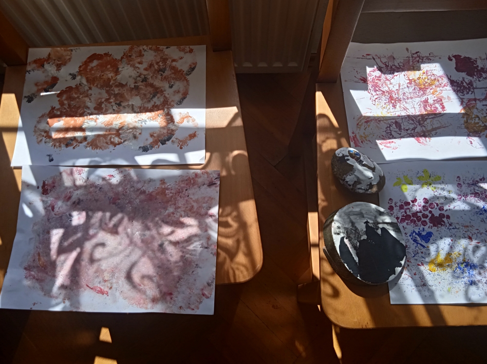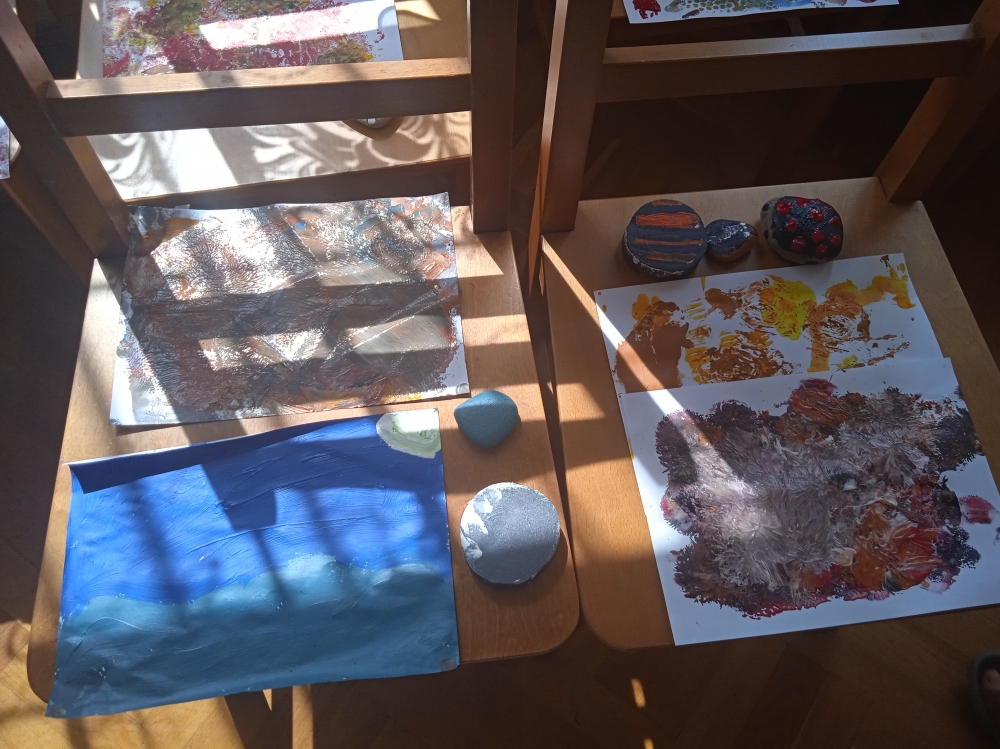 Powstały piękne malunki gór na plastrach drewna, pieczątki tworzone za pomocą drewna, sznurka i farb a także kolorowe kamienie i balony :)